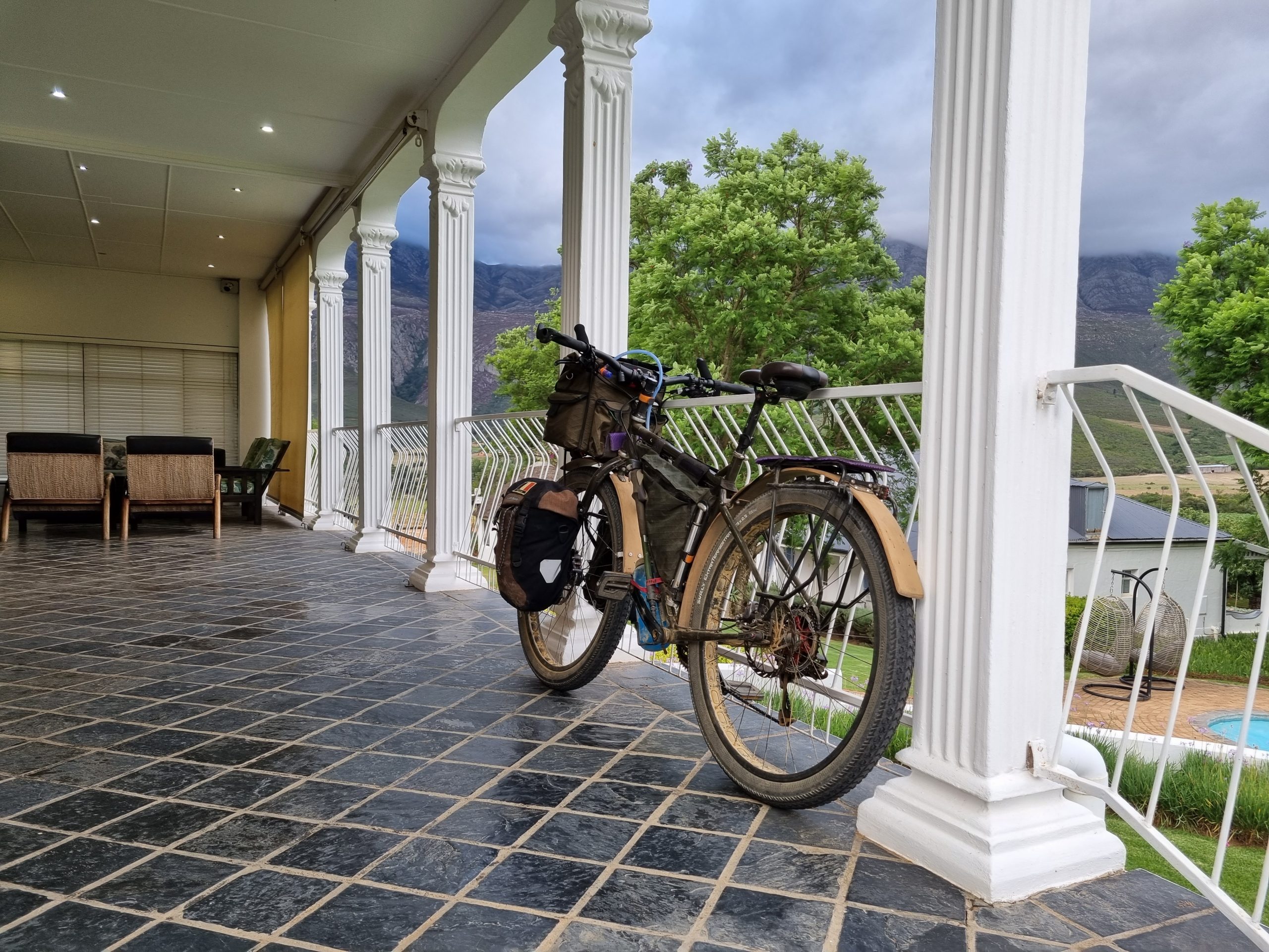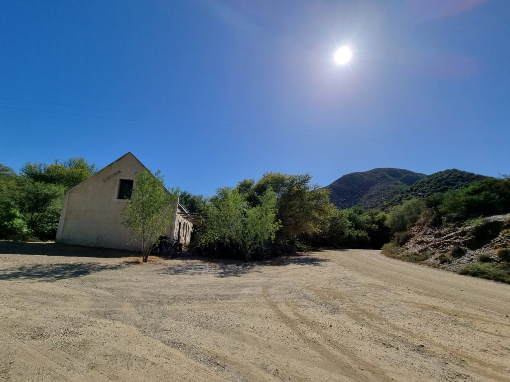 Bei der Künstlergalerie – übrigens mitten im Nichts- mache ich halt, schaue mir die Galerie an und nutze das Kaffee um mich mit Erfrischungen vollzustopfen. Wahrscheinlich eine Nachwirkung von permanenter Sonneneinstrahlung und Staubüberschüttung. Nach dieser ausgiebigen Pause geht es wieder auf die Piste, die Bilder geben ganz gut wieder wo man da radelt, die jeweils in den Hügeln sichtbare Piste ist genau die eine welche ich ständig folge. Nachmittags ziehen Wolken auf und die Temperatur fällt dadurch unter 30 Grad, welch Wohltat. Obendrein sind die letzten 8 Kilometer auch noch asphaltiert, das rollt nach einem Tag gerüttele ganz gut. Ab Ca 14:00 kann ich ihn erkennen, den Swartberg Pass, das Ziel meiner ersten Radetappe in Südafrika. Am liebsten würde ich sofort weiterziehen und mich mit ihm anfreunden, den Swartberg Pass. Da ich dies nicht schaffen würde, ziehe ich gegen 16:00 im Restaurant / Guesthouse Patat ein wo zum Glück noch ein Zimmer frei ist.