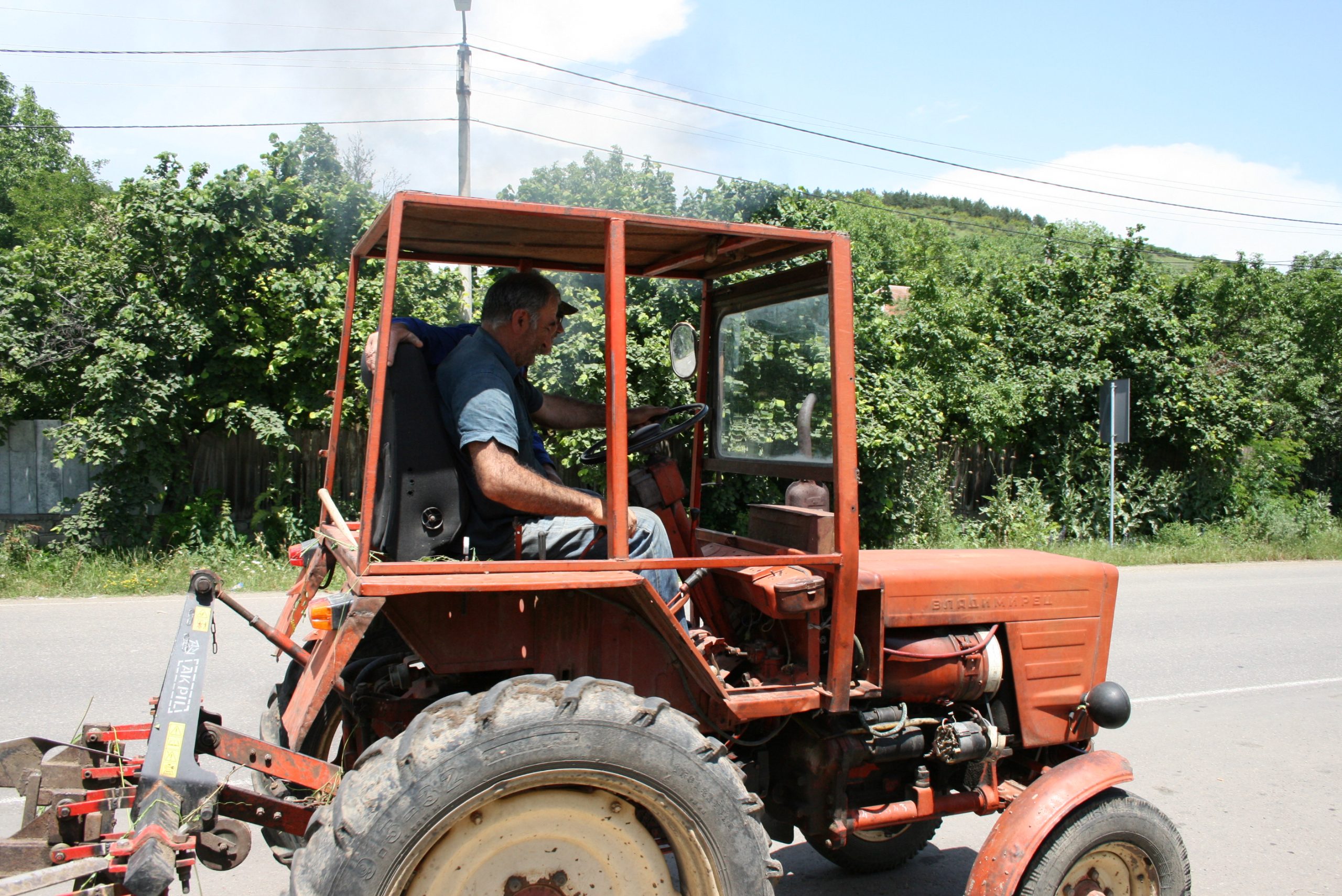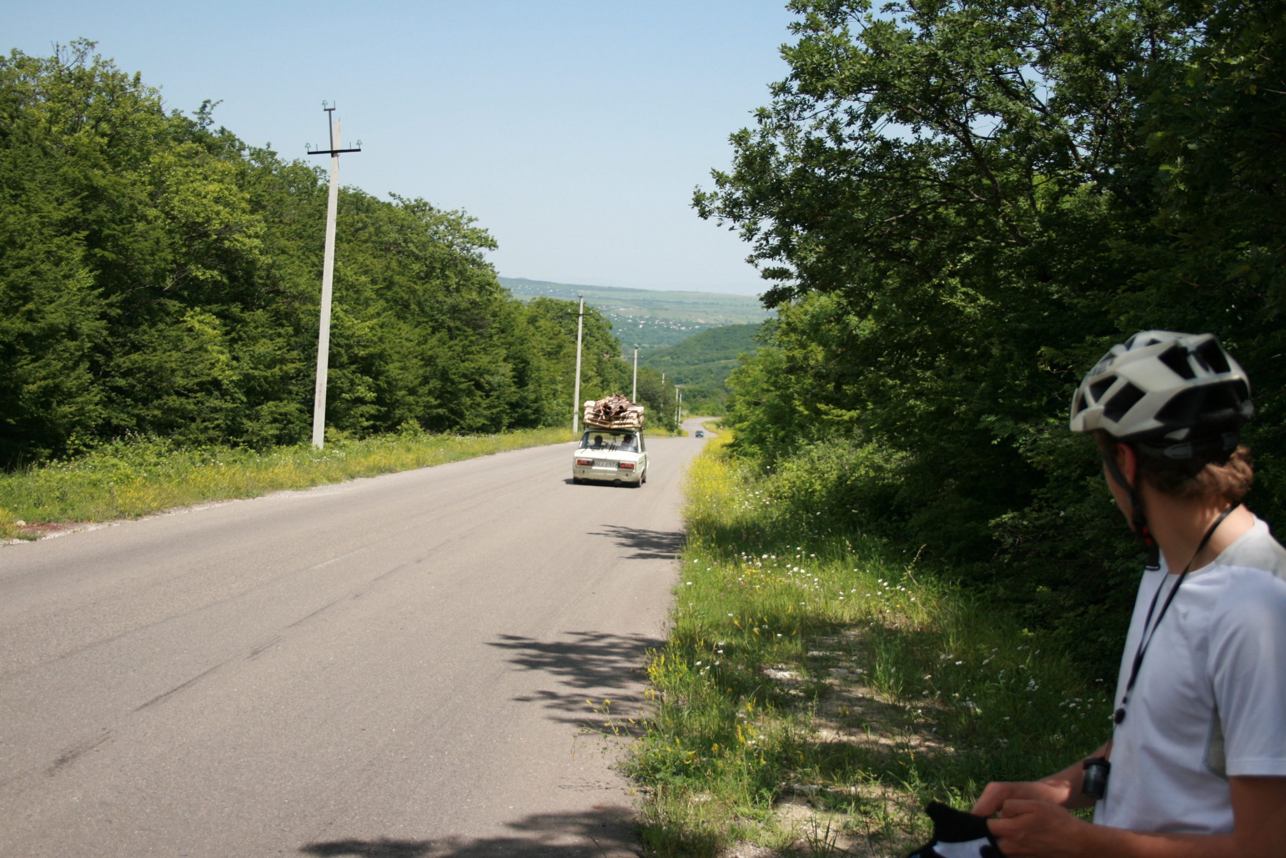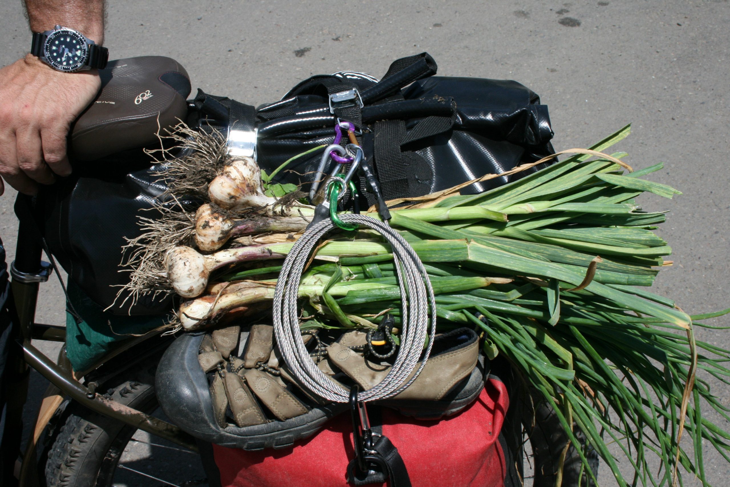 Es war irre Wetter, wir waren gut gelaunt und wollten das nächste Etappenziel erreichen. Im Anstieg nach Saghrasheni nervte meine Vorderradbremse mit Dauerquietschen. Daher hielt ich an der Bushaltestelle an um nachzuschauen was los war. Josh gesellte sich ebenfalls dazu uns setzte sich in den wohltuenden Schatten. Plötzlich kam ein alter Mann mit einer Sense in der Hand auf uns zu, die obligatorischen Fragen folgten: Nationalität und Reiseroute. Es stellte sich heraus das der Mann bereits 2 Jahre als Soldat in Magdeburg war. Es muss lang vor der Wende gewesen sein. Während ich mein Rad weiter “Entquietchte” verschwand der Herr in seinem neben der Bushaltestelle liegenden Nutzgarten. Plötzlich kam er wieder zurück und schenke uns ein Bündel Zwiebeln um wortlos wieder zu verschwinden und mit einem Bündel frischen Knoblauch zurückzukommen. Wir bedankten uns höflich als offensichtlich sein Taxi eintraf. Ein roter Traktor trug unseren Gönner davon.
