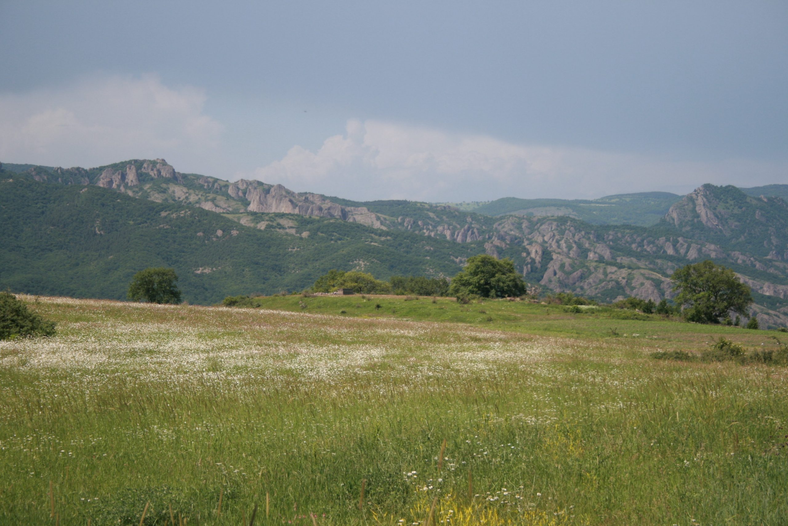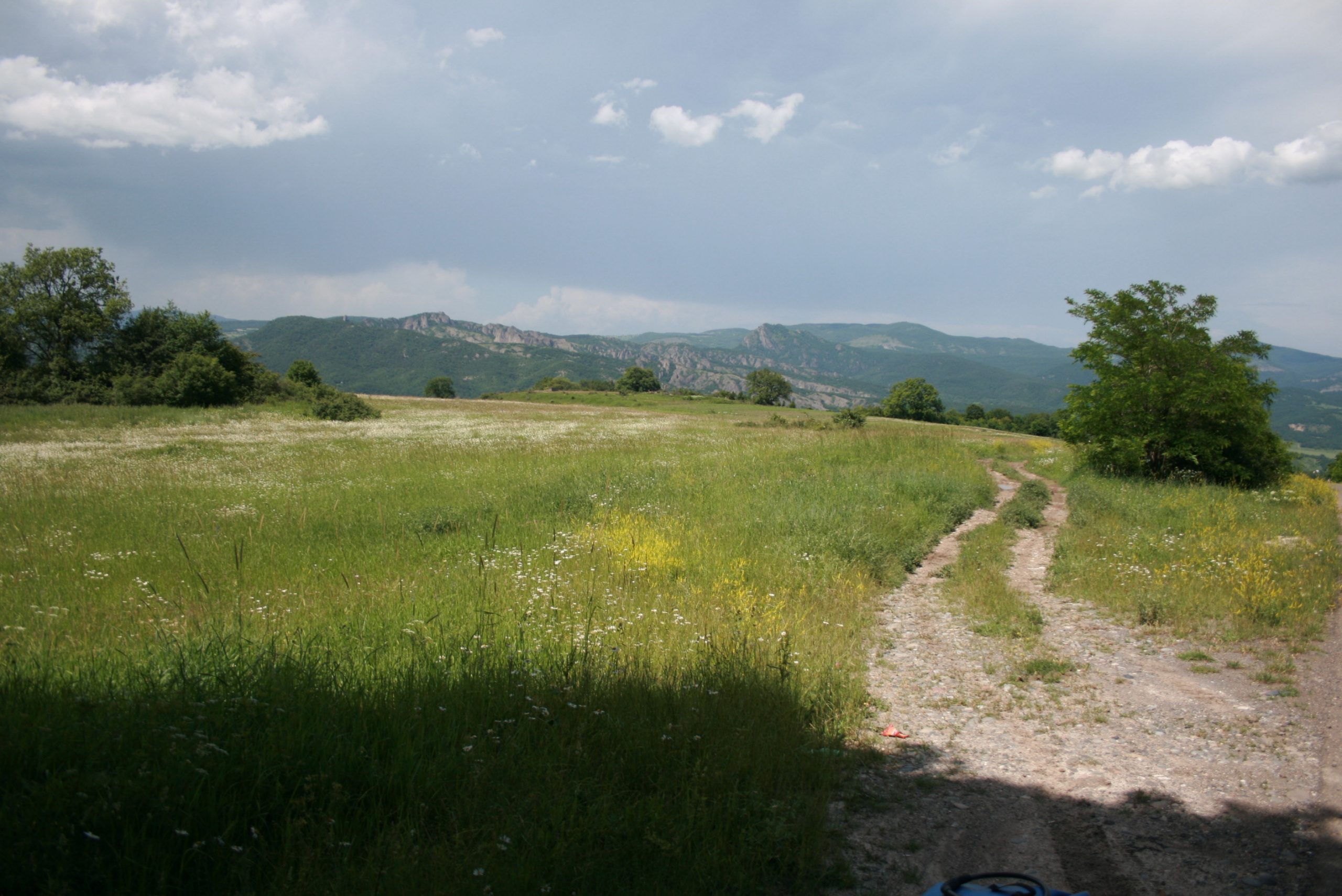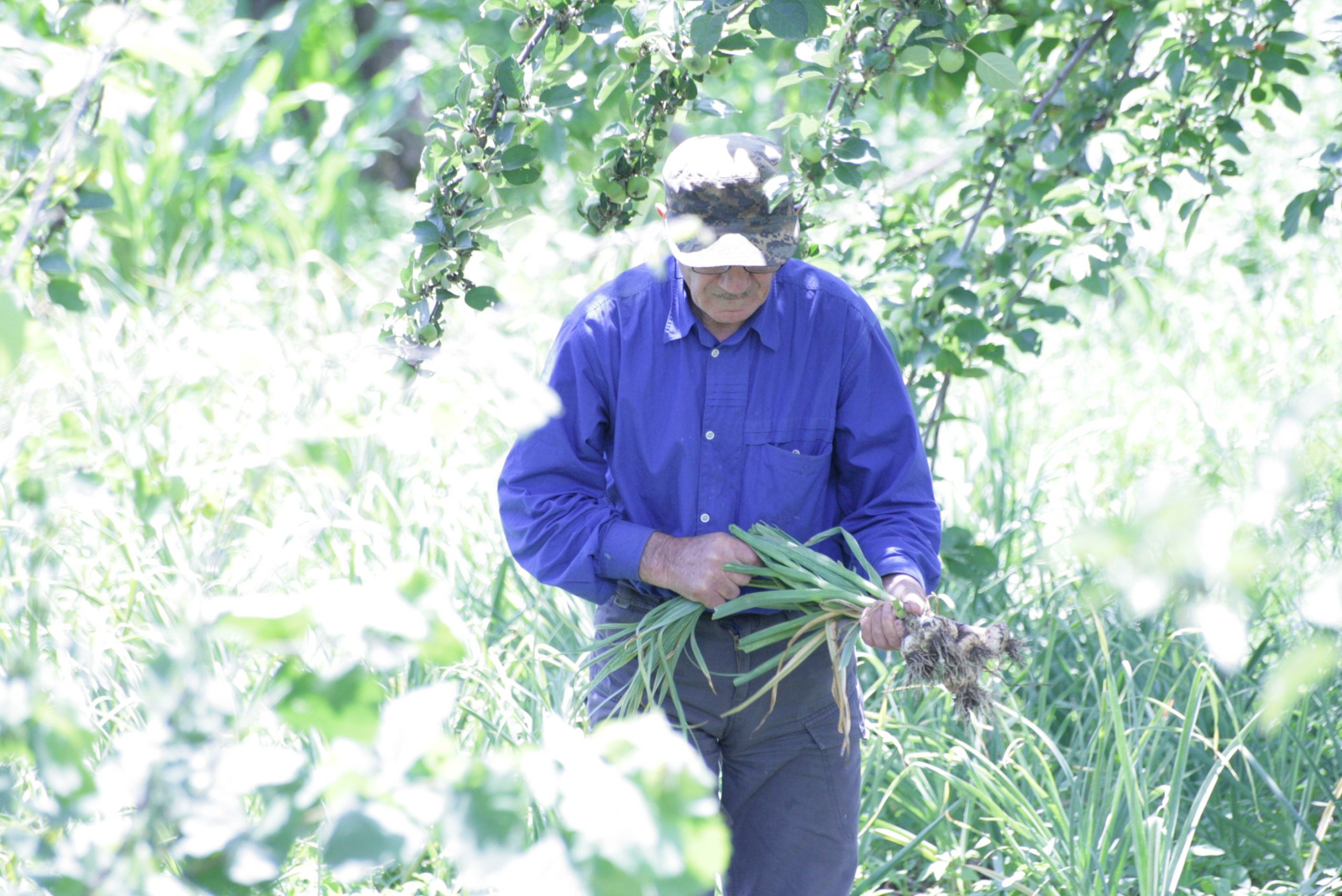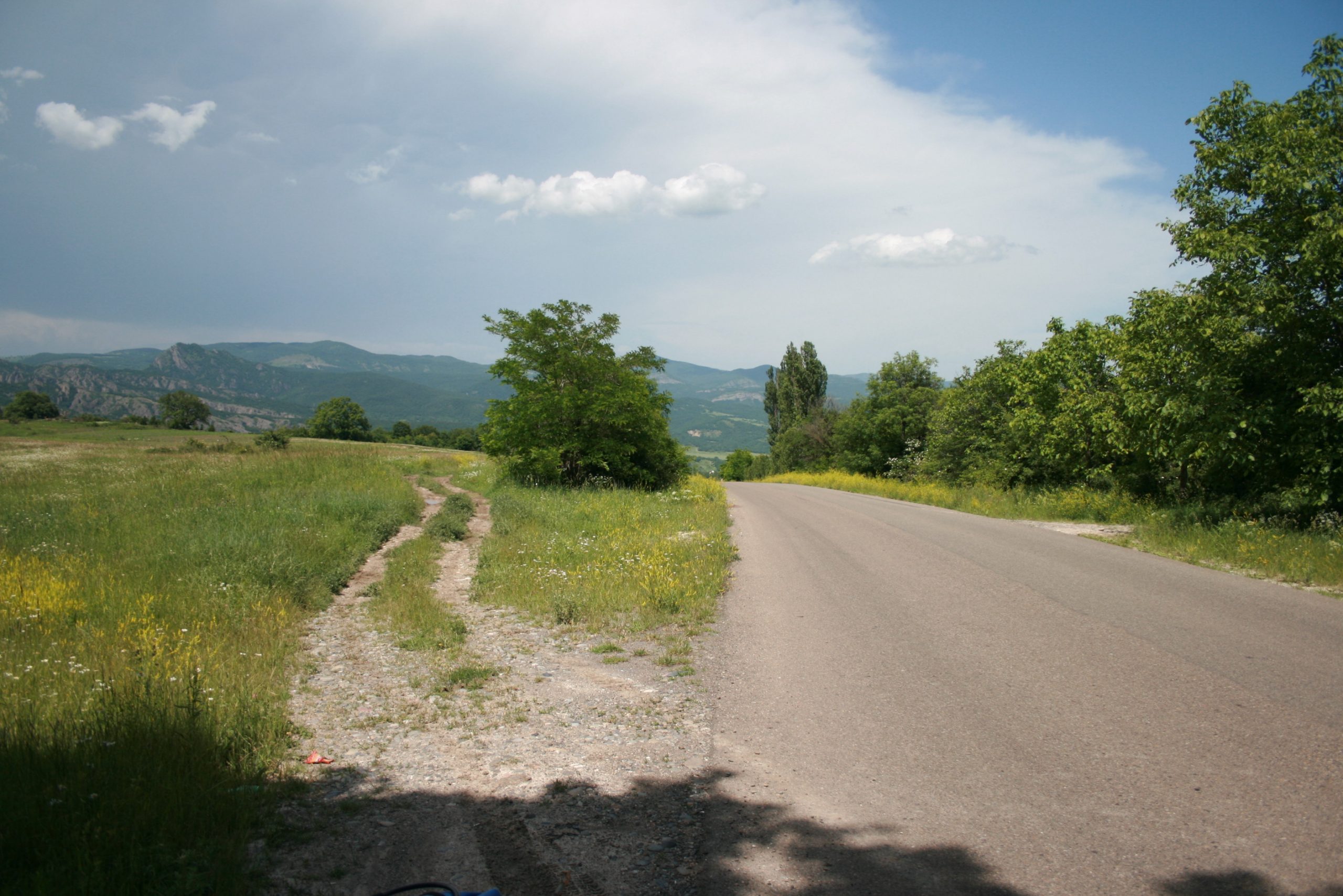 Es war irre Wetter, wir waren gut gelaunt und wollten das nächste Etappenziel erreichen. Im Anstieg nach Saghrasheni nervte meine Vorderradbremse mit Dauerquietschen. Daher hielt ich an der Bushaltestelle an um nachzuschauen was los war. Josh gesellte sich ebenfalls dazu uns setzte sich in den wohltuenden Schatten. Plötzlich kam ein alter Mann mit einer Sense in der Hand auf uns zu, die obligatorischen Fragen folgten: Nationalität und Reiseroute. Es stellte sich heraus das der Mann bereits 2 Jahre als Soldat in Magdeburg war. Es muss lang vor der Wende gewesen sein. Während ich mein Rad weiter “Entquietchte” verschwand der Herr in seinem neben der Bushaltestelle liegenden Nutzgarten. Plötzlich kam er wieder zurück und schenke uns ein Bündel Zwiebeln um wortlos wieder zu verschwinden und mit einem Bündel frischen Knoblauch zurückzukommen. Wir bedankten uns höflich als offensichtlich sein Taxi eintraf. Ein roter Traktor trug unseren Gönner davon.