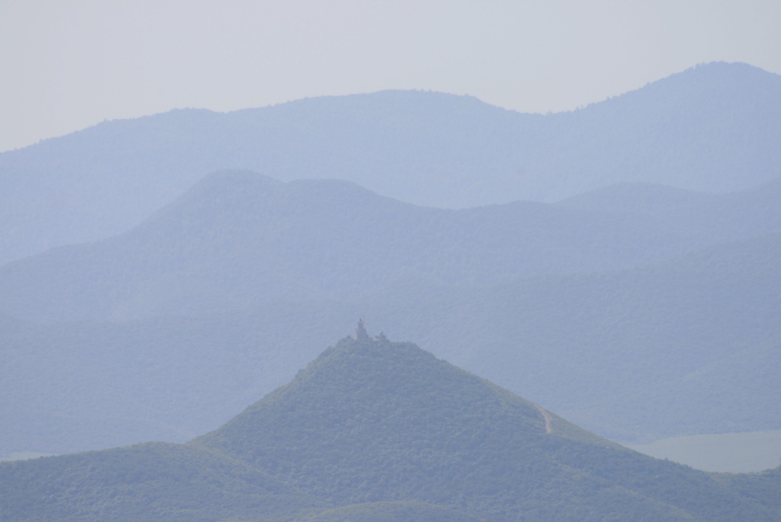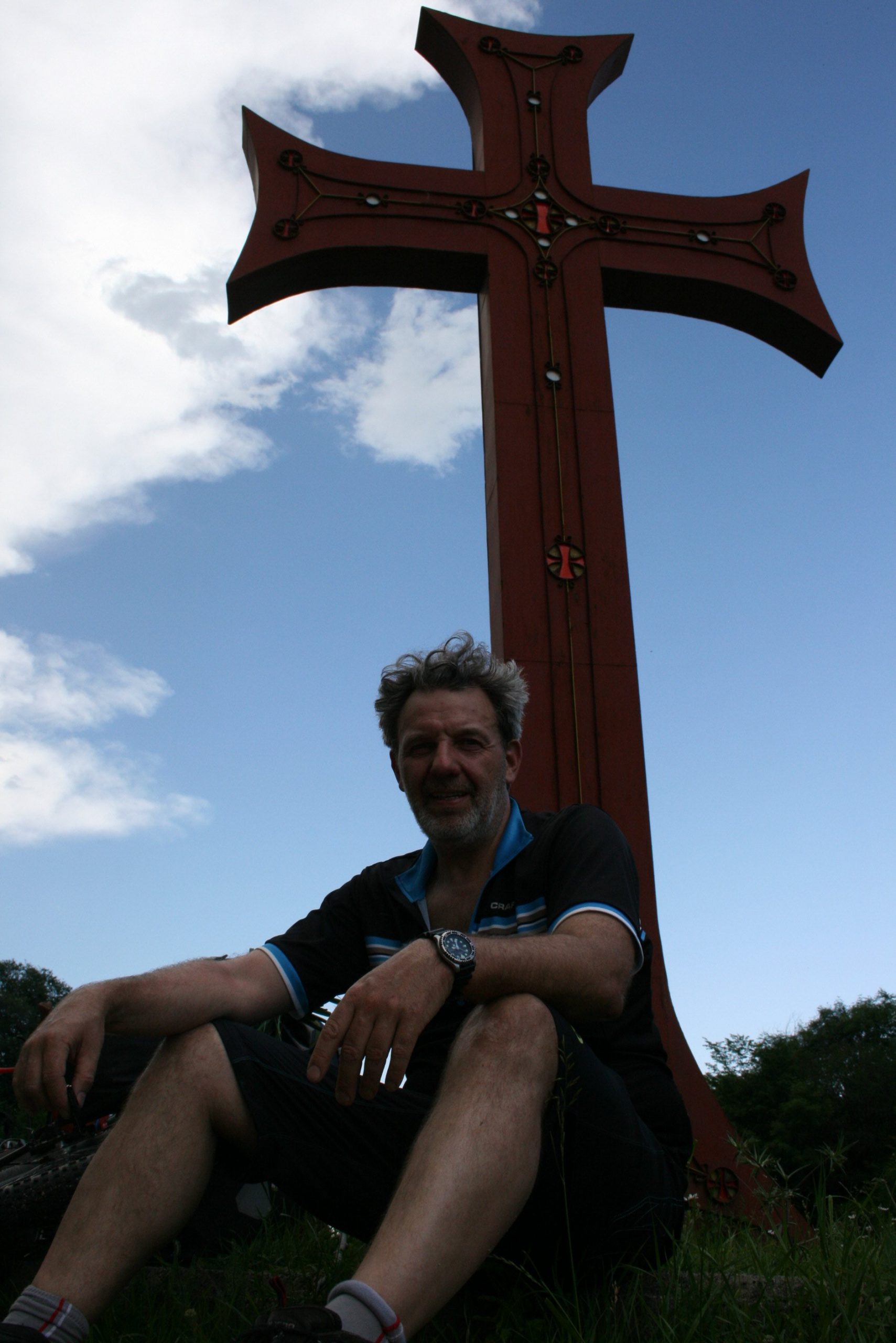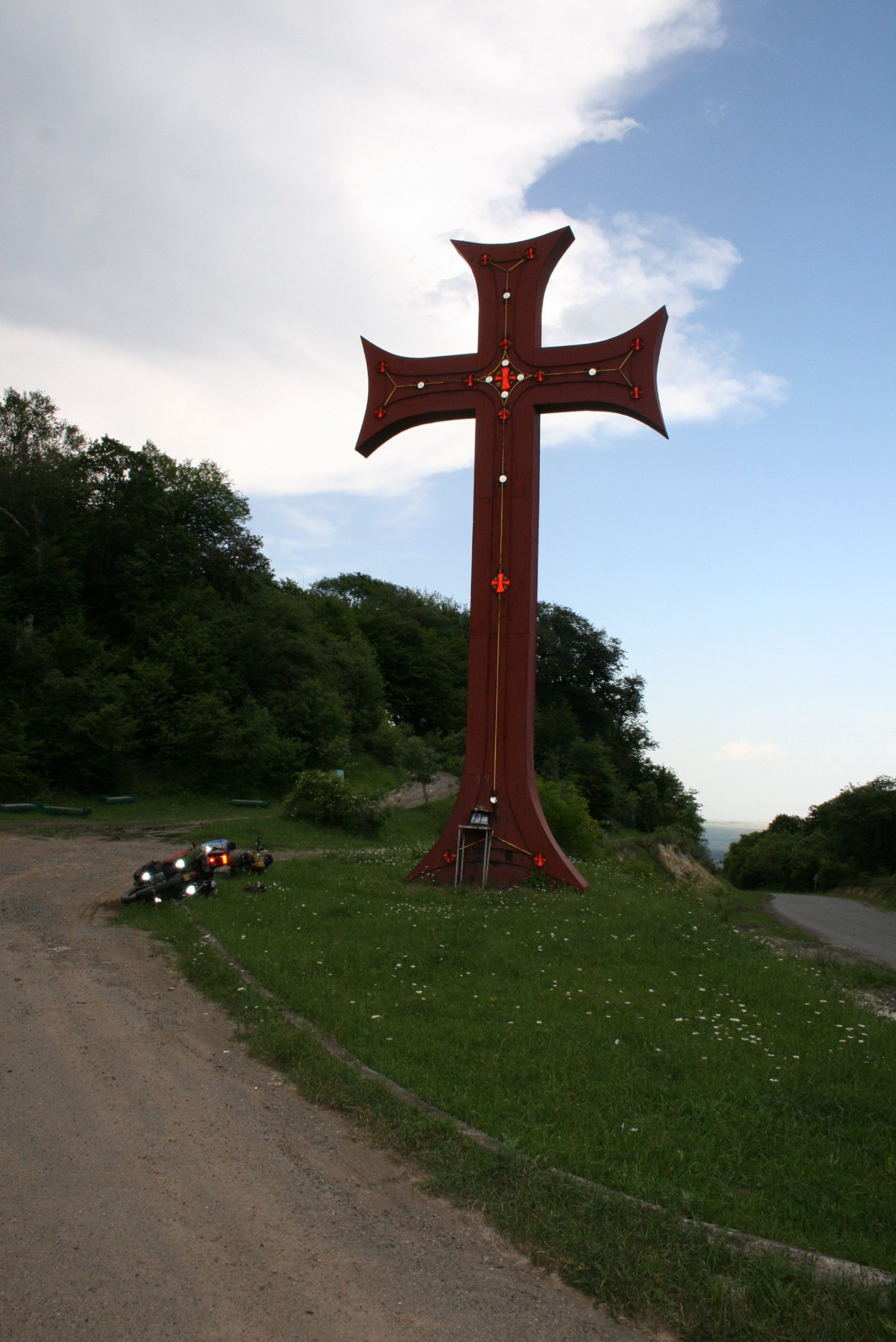 Wir sattelten wieder auf und machten uns auf den weg. Was ein paar Kilometer weiter kam war wie ein Kurzschluss auf unsere Waden. Der 7 Kilometer lange Anstieg nach Teri Tskaro bei brütender Hitze hat uns die Waden leergezogen. 95 % der gemachten Höhenmeter lagen auf diesen 7 Kilometern. Auf dem höchsten Punkt der Strecke haben wir am Kreuz hält gemacht und noch eine Kerze für eine gesunde Weiterfahrt angezündet.