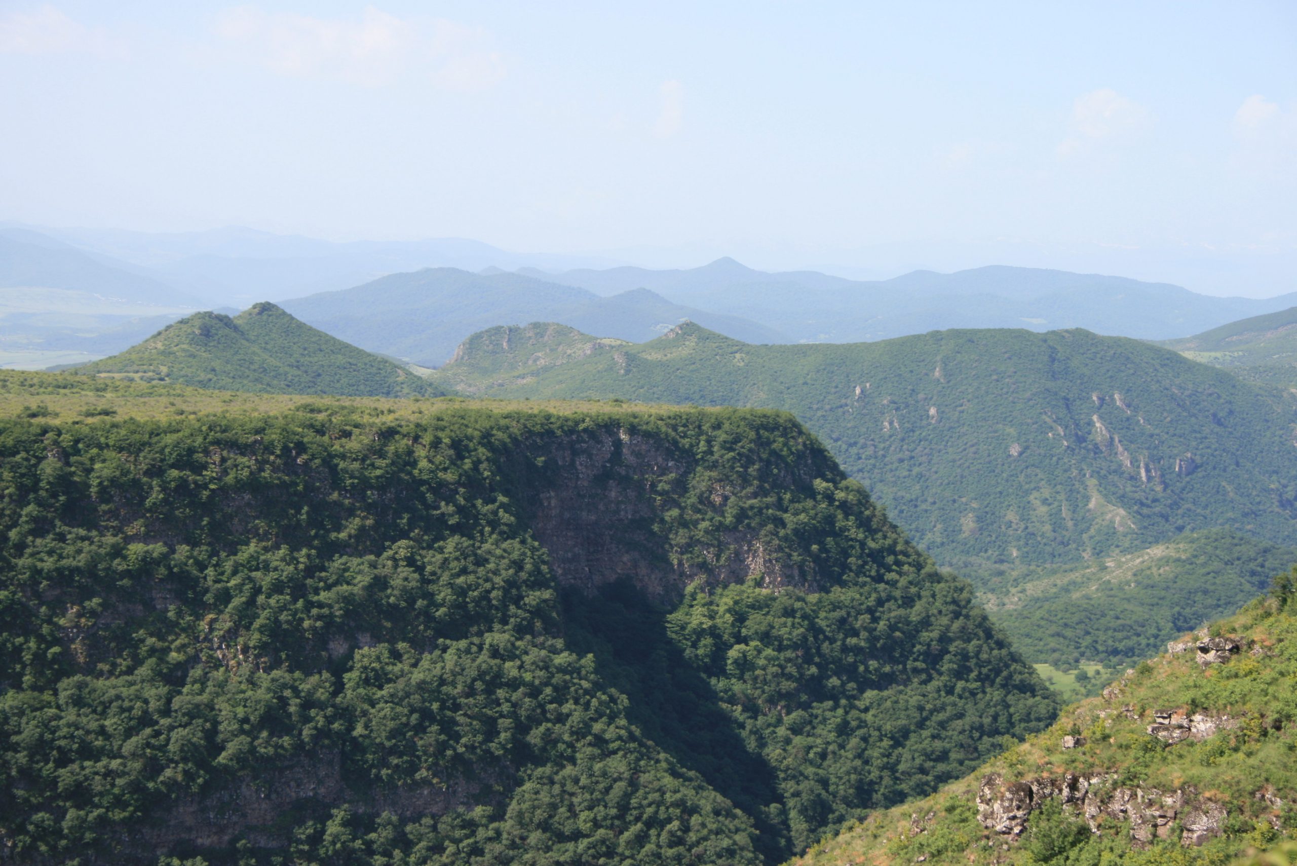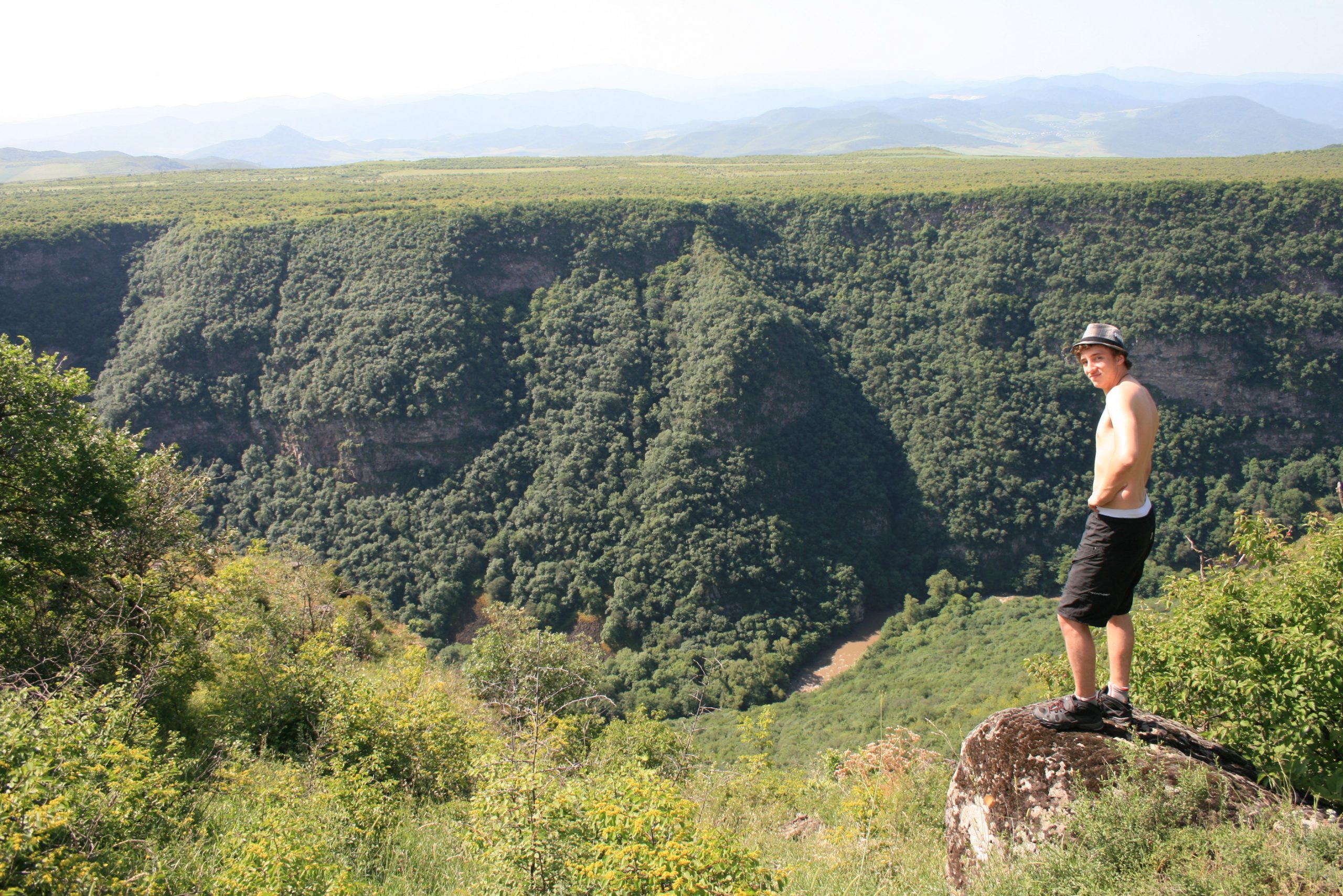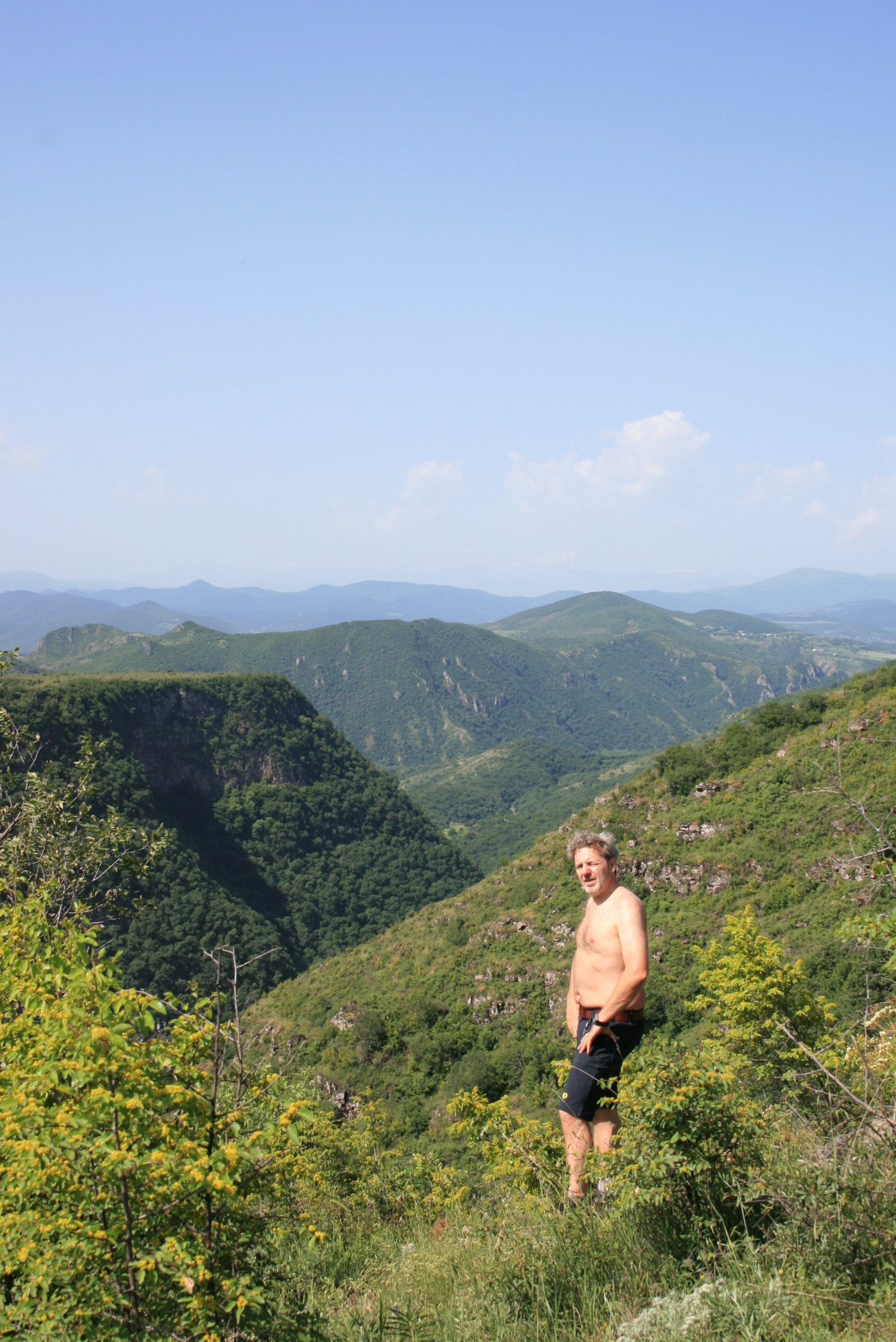 Der Ort war Überschaubar, begrüßt wurden wir von den freilaufenden Schweinen und von einem volltrunkenen der beim Versuch zu uns zu kommen bäuchlings im Graben landete. Wir beließen ihn dort und fuhren weiter. Rainers Beschreibung war schlicht jedoch zutreffend: “am rosa Haus rechts hoch zum Plateau”. Wir folgten der Piste und trafen unten an der Brücke die der einzige weg über den Fluss war, eine Gruppe trinkender Armenier. Wieder als erstes kamen die Klärung der Nationalität und der Reiseroute und anschließend die Aufforderung mitzutrinken. Der Notzettel , welcher uns von Rainer für solche Situationen mitgegeben wurde, musste her. Dieser sollte und musste Rettung verheißen. E’kimi ari Alkohol was so viel heißen soll wie,, wenn ich Alkohol trinke muss ich zum Arzt”. Nach Meinung der Armenier lag es an dem schlechten Alkohol den ich bisher getrunken hätte. Patt. Nach einiger Verhandlung, nahmen wir eine Fanta Flasche mit dem vermeintlich gesunden Alkohol mit hinauf zum Plateau.
