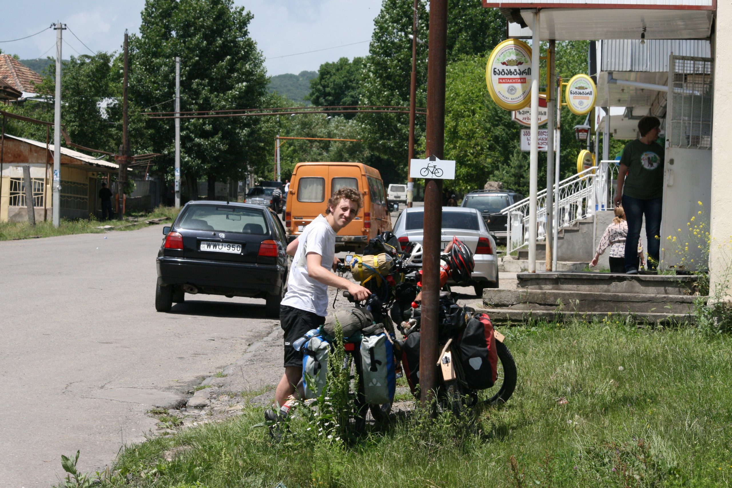 Als wir kurz vor der Dunkelheit in Khramhesi ankamen regnete es in strömen. Mal wieder rettete uns eine Bushaltestelle. Wir beschlossen vorerst dort zu bleiben und schon mal etwas zu kochen. Prompt hatten wir Besuch und waren auch schon in ein Gespräch verwickelt. Da unser Wasservorrat fast komplett aufgebraucht war bot uns Dako an uns zum nächsten “Supermarkt” zu fahren. Josh führ mit zum 7 Km entfernten Supermarkt und ich fing an zu kochen, rote bete Eintopf mit Georgischer Wurst, dem geschenkten Knoblauch, Zwiebeln und Bratkartoffeln. Pünktlich zum Essen war Josh wieder da und wir verspeisten unser Mahl. Die mitgebrachte “Bonus-cola” war hervorragend.