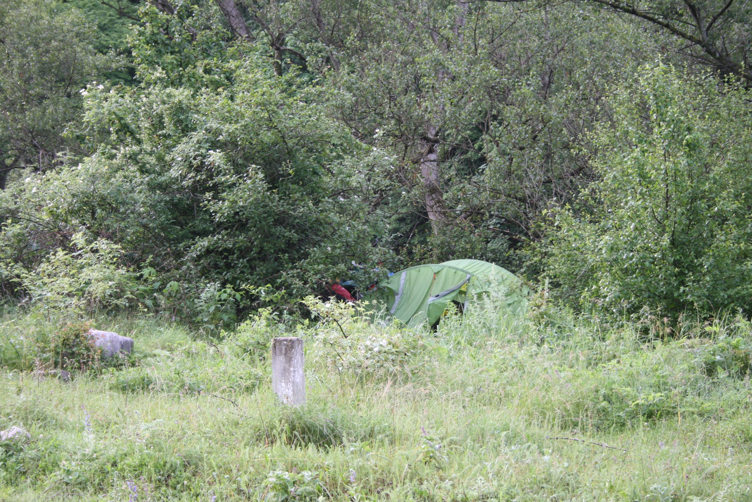 Nach dem Essen zeigte Dako uns jede Menge Gelegenheiten um unser Zelt aufzuschlagen. Die Vorschläge reichten vom Fußballplatz über die bereits eingenommene Bushaltestelle bis hin zum Hauseingang eines verlassenen Hauses. Wir zogen es vor uns wieder anzuziehen und 1 Km. zurück, gegenüber von einem Friedhof unser Zelt aufzuschlagen. Die Nacht war für mich nicht besonders ruhespendend, denn der 20 m unter uns tosende Bach war mir schlichtweg zu laut.