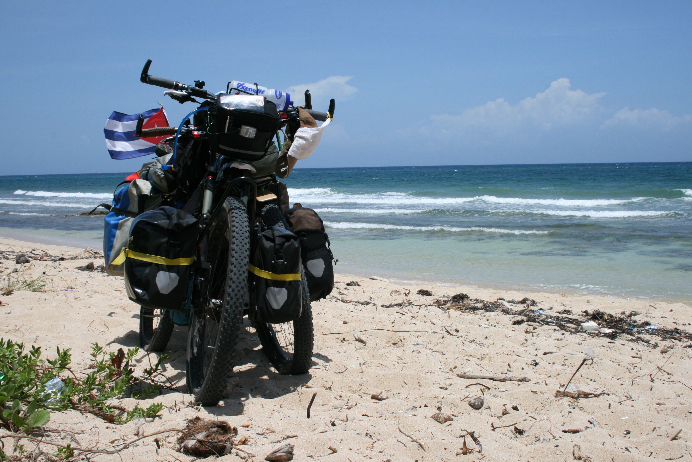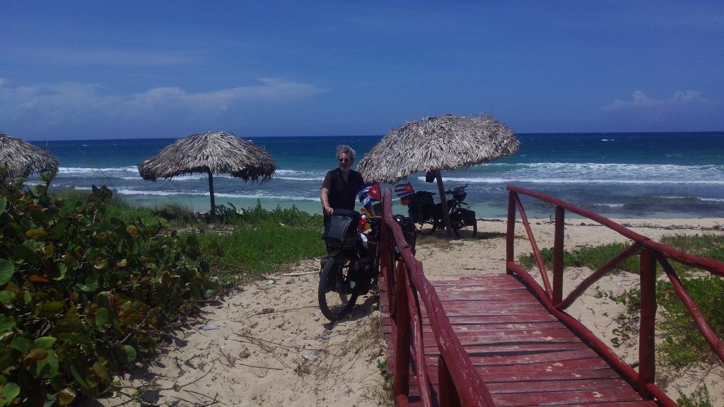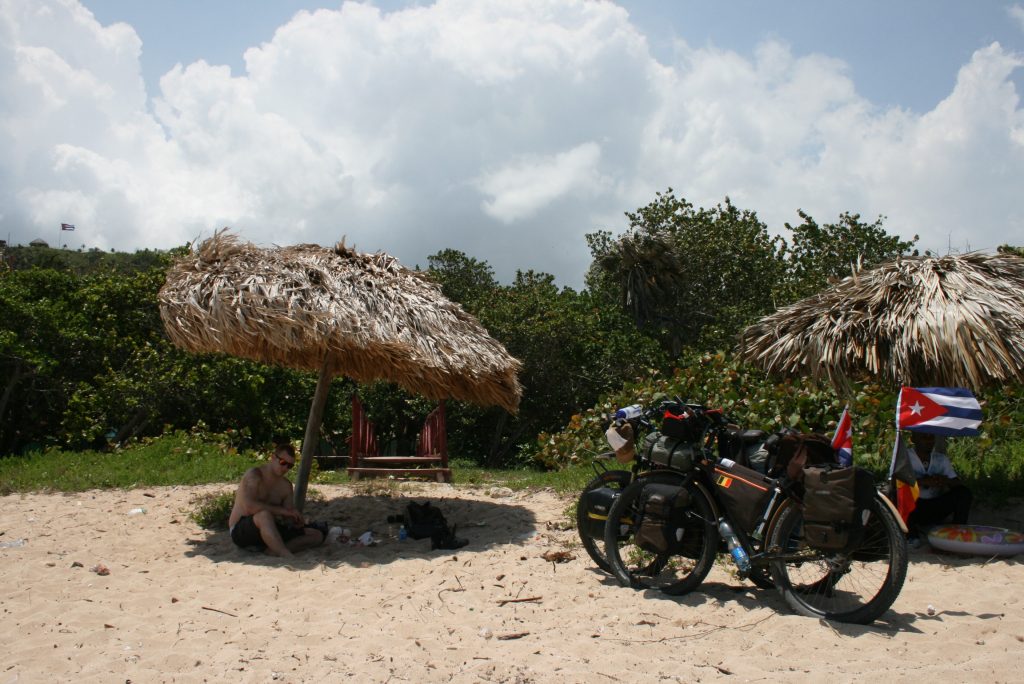 Westlich an San Juan vorbei kommen wir auf der Küstenstraße Via Blanca welche bis Puerto Libre Richtung Westen gefolgt wird. Genau an der Stelle wo wir zum Strand abbiegen wollen sehen wir das Holländische Pärchen, welches Cuba mit öffentlichen Verkehrsmittel bereist, vorbeifahren. Die Holländer folgen der Via Blanca und wir fahren Richtung Strand. Noch Ca. 7 Km in brütender Hitze, Ric ist kurz davor zu schmelzen. Er bekommt eine Kühlende Dusche aus der Trinkflasche, ein nasses Basecap auf den Kopf und motivierende Bilder vom Strand und dem Kühlen Meer verpasst. So schaffen wir es zum Strand und finden einen netten Platz für die Mittagspause. Was machen wir nun? Geplantes Tagesziel mittags erreicht. Beiden ist die Gier nach mehr Kilometern ins Gesicht geschrieben und so schwingen wir uns nach der Mittagspause wieder auf die Räder, weiter Richtung Habana. Der Planet brennt gnadenlos, es sind zwischen 36 und 38 Grad im Schatten.
