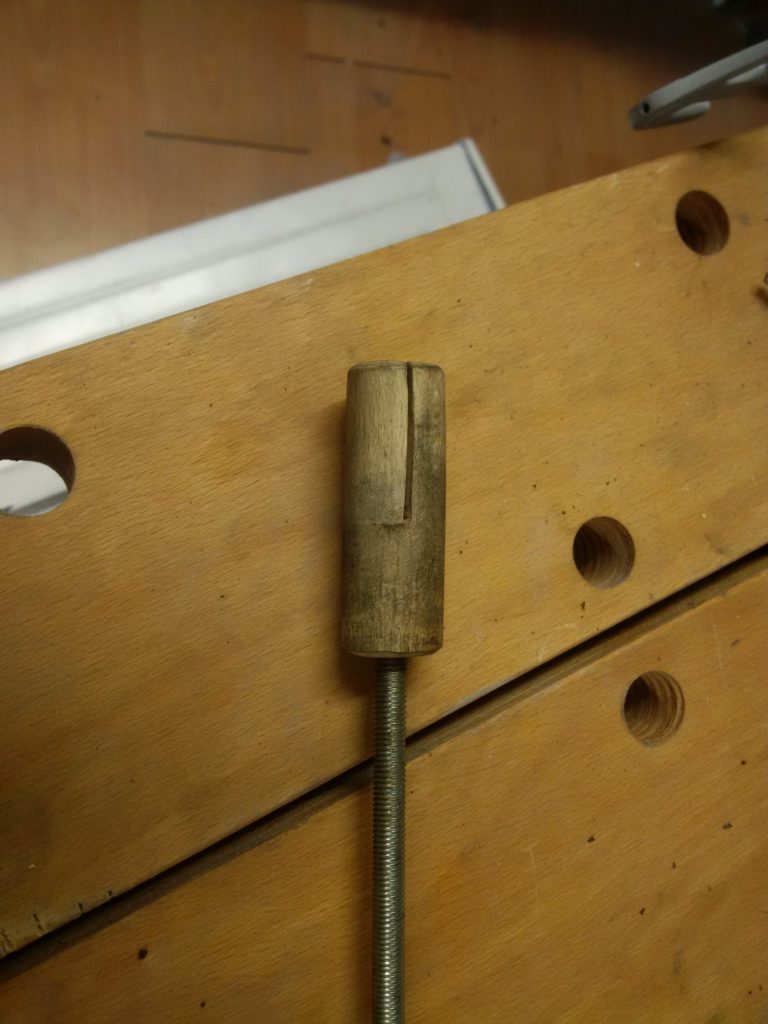 Das Rad wurde demontiert, der Rahmen vom Lack befreit und entrostet. Zum Entrosten der Innenseite des Sitz- und des Steuerrohrs habe ich mir selbst eine Schleifvorrichtung wie auf den Bildern gezeigt angefertigt. Das funktionierte zuverlässig und schnell.