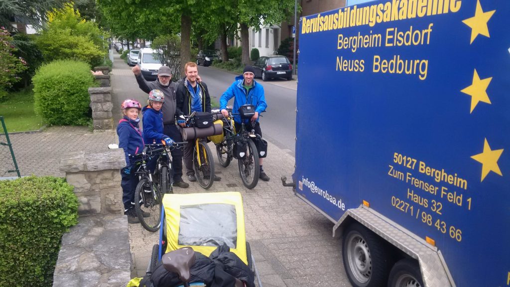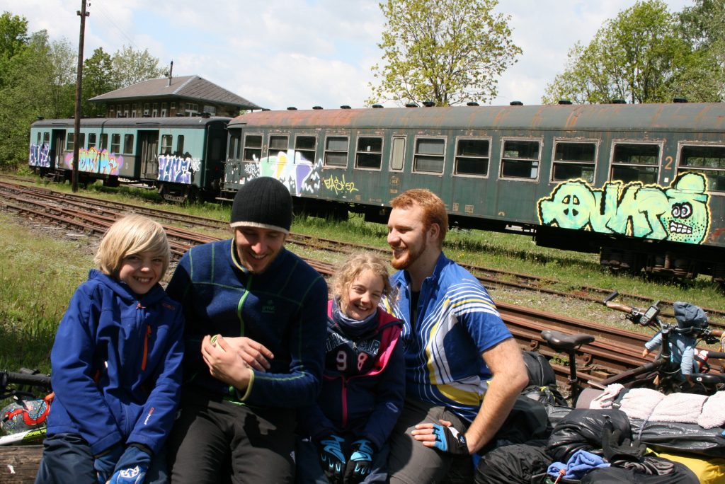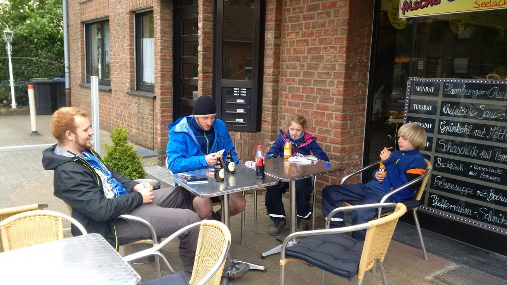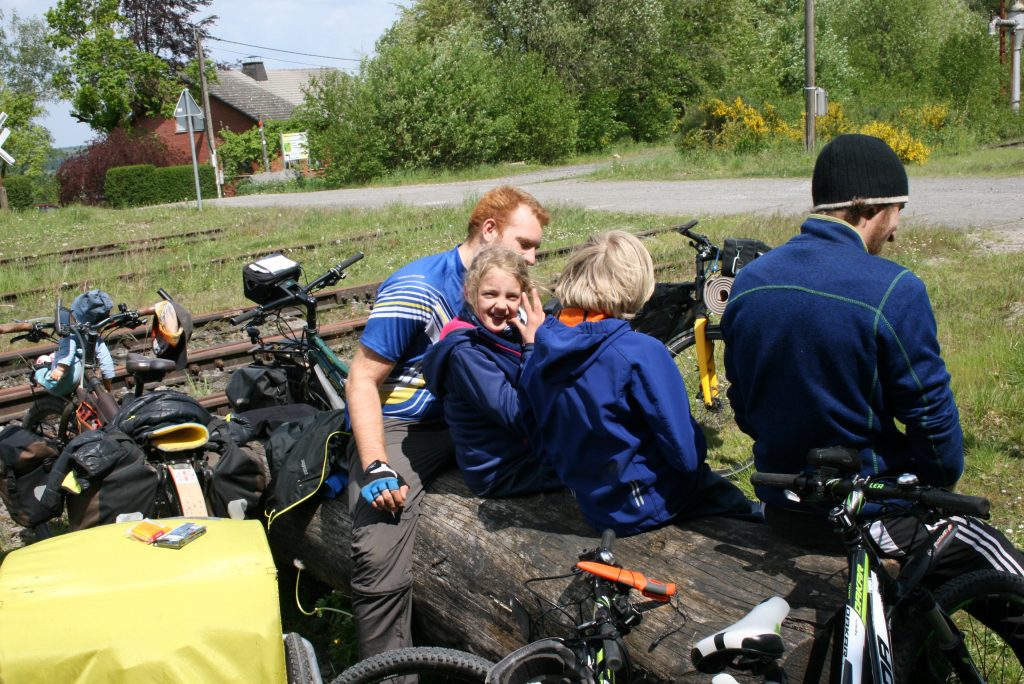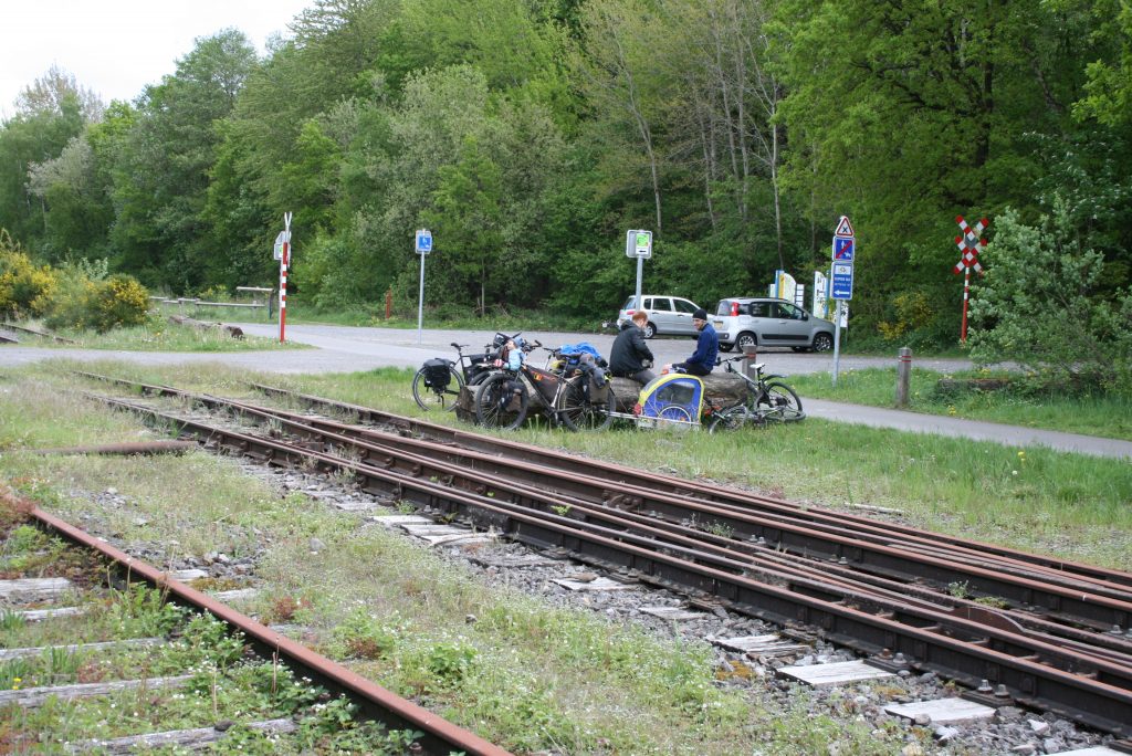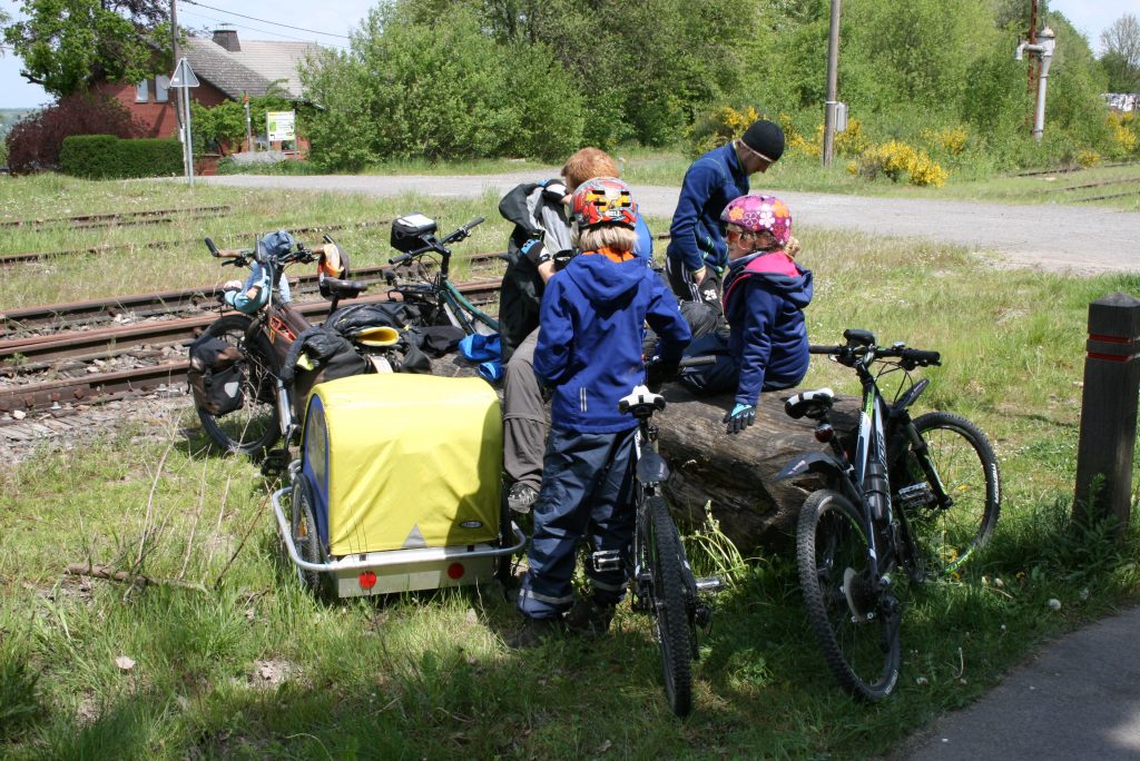 Wir schaffen es tatsächlich 2 Stunden früher unser Lager zu verlassen, also steht dem Tagesziel 45 Km im Moment noch nichts im Weg. Wir wissen dass wir die ersten 14 Km weitestgehend bergauf fahren müssen und orientieren und an die Hinweisschilder der Vennbahn. Auf diesem Teil der Strecke stehen nämlich alle 500 Meter Schilder mit der verbleibenden Distanz bis Aachen Zentrum. Es ist für die Kinder irgendwie sehr motivierend stetig kleinere Zahlen auf den Schildern zu lesen.
